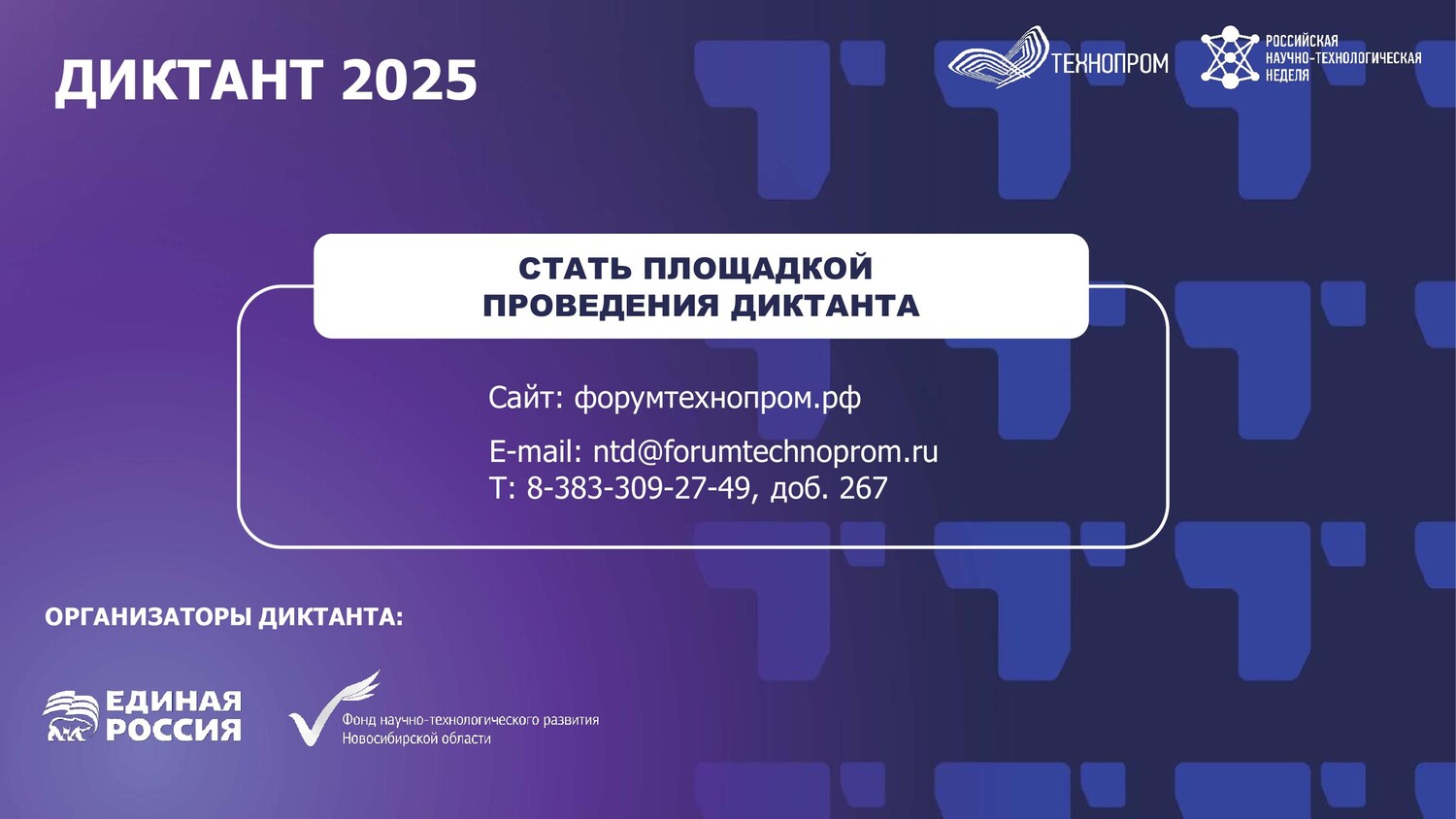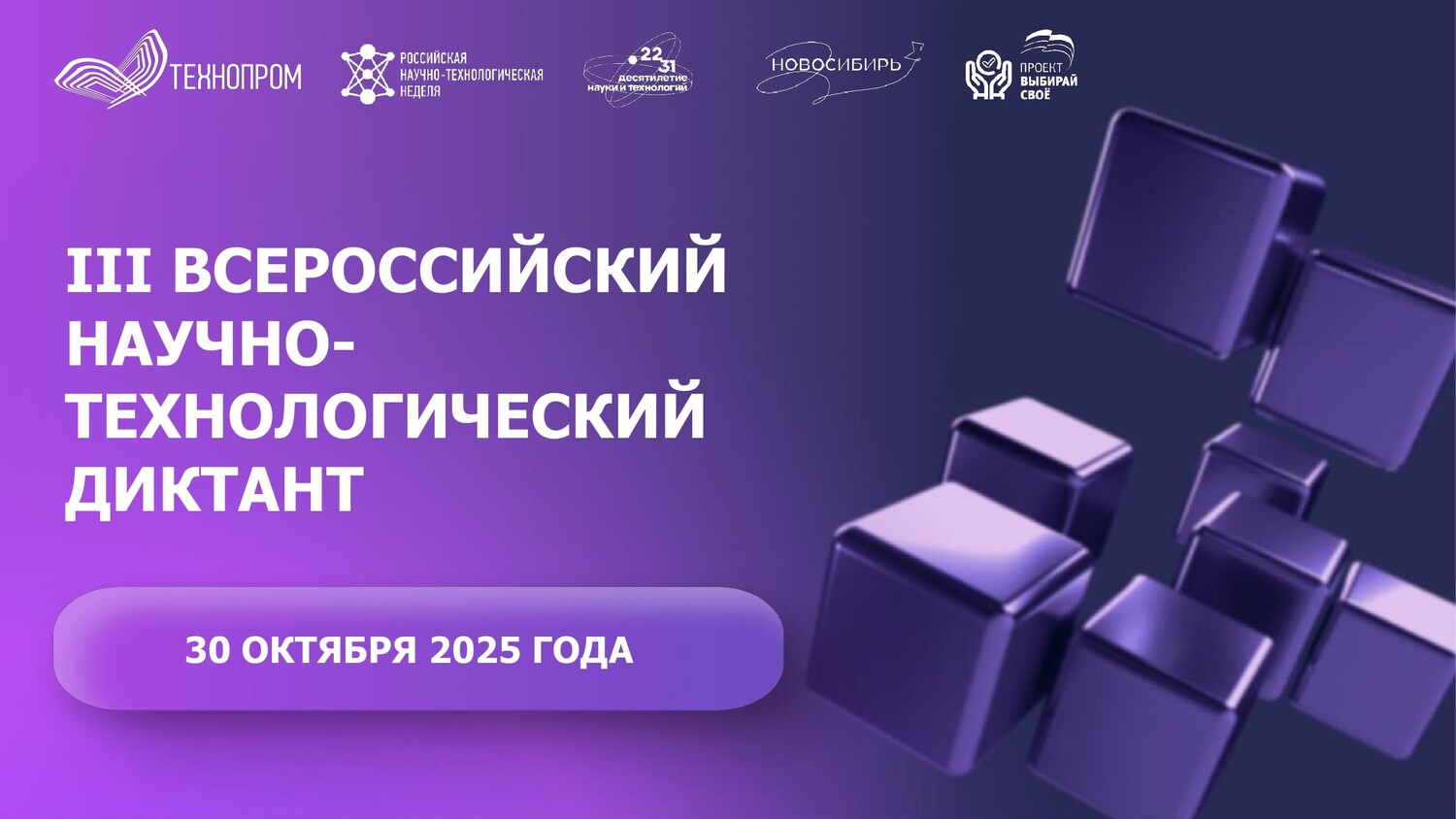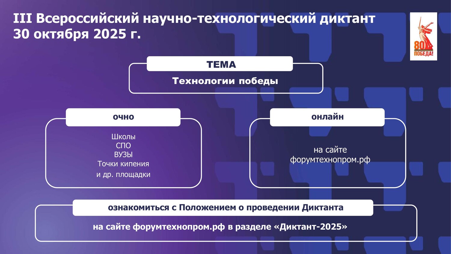 В рамках реализации федерального проекта Партии «Единая Россия» «Выбирай своё» 30 октября 2025 года запланировано проведение III Всероссийского научно-технологического диктанта (далее – Диктант), основной темой которого станут «Технологии победы».