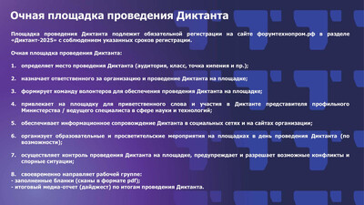 К участию в Диктанте приглашаются обучающиеся от 12 лет. Регистрация форумтехнопром.рф раздел "Диктант-2025". В диктанте 25 вопросов, которые состоят из 3-х блоков. 5 - базового уровня: общеизвестные факты о научно-технологических достижениях в годы ВОВ, 17 вопросов на образное мышление, системную логику и эрудицию. 3 вопроса на сообразительность.