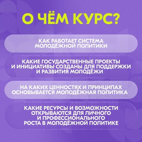 Слушателями курса могут стать молодые люди, которые хотят работать в сфере молодёжной политики, или специалисты, которые работают в этой области. Они узнают о методах, задачах и ключевых принципах молодёжной политики в России.