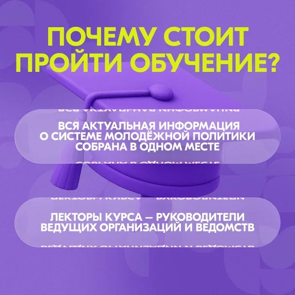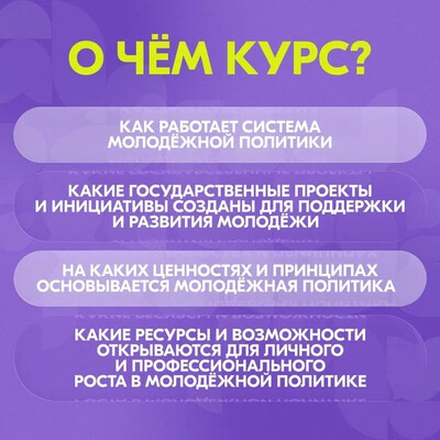 На платформе «Академия Росмолодёжи» запущен онлайн-курс «Система молодёжной политики». В его создании принимали участие представители Минпросвещения России, Минобрнауки и Минкультуры России, Росмолодёжи, Движения Первых, президентской платформы «Россия – страна возможностей», Российского общества «Знание», Института развития интернета. Курс реализуется в рамках программы Росмолодёжи «Проводники смыслов».