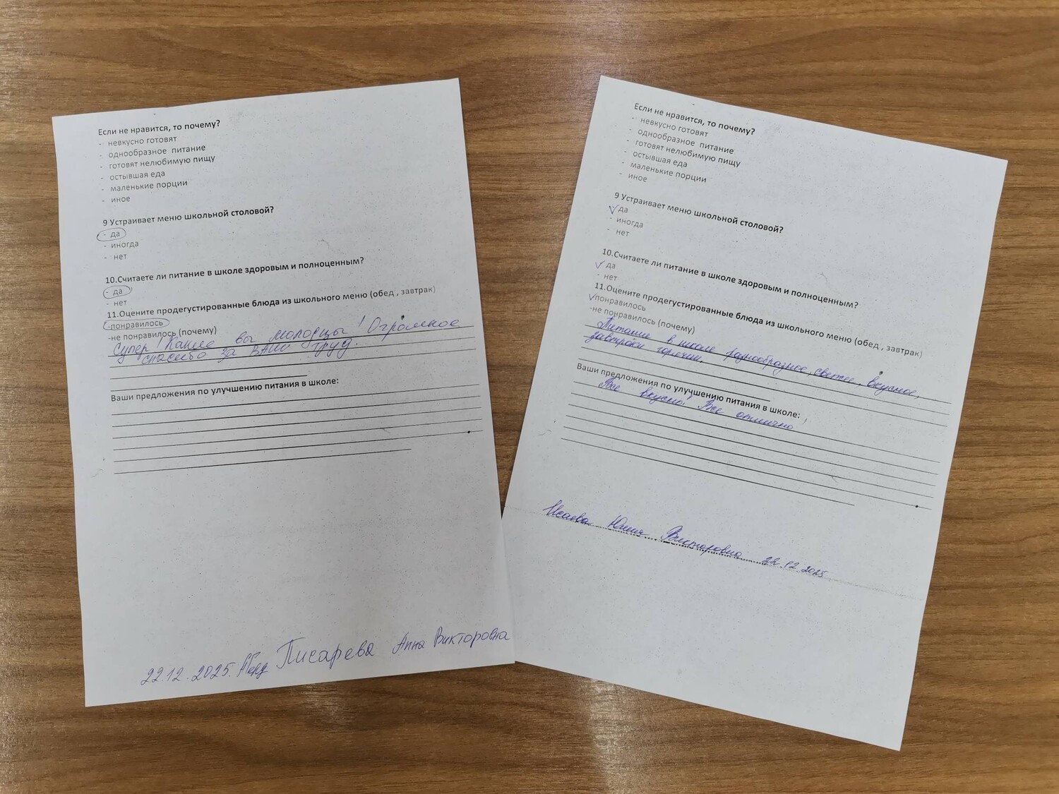 На дегустацию были приглашены родители из 2а класса: Писарева Анна Викторовна и Исаева Юлия Викторовна. Согласно заполненным анкетам, дегустация горячего завтрака прошла успешно. Родители отметили чистоту в обеденном зале, наличие санитарной одежды у сотрудников, осуществляющих раздачу готовых блюд, вкусовые качества дегустируемых блюд.